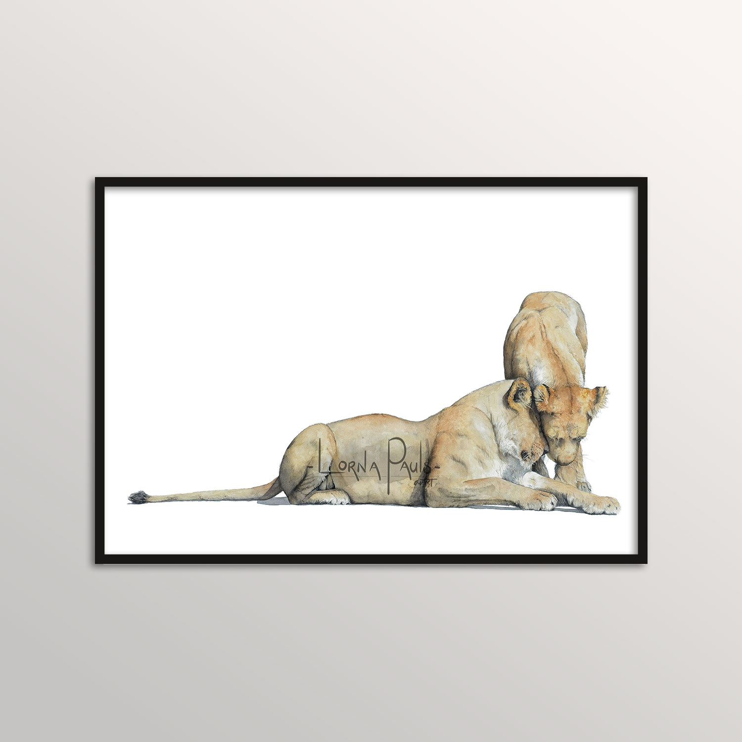 Lorna Pauls’ hand-painted watercolour weaves two lionesses in tender head-to-head intimacy, their golden warmth aglow on the savanna. Vibrant matte or collector-grade giclée prints radiate sisterly grace.