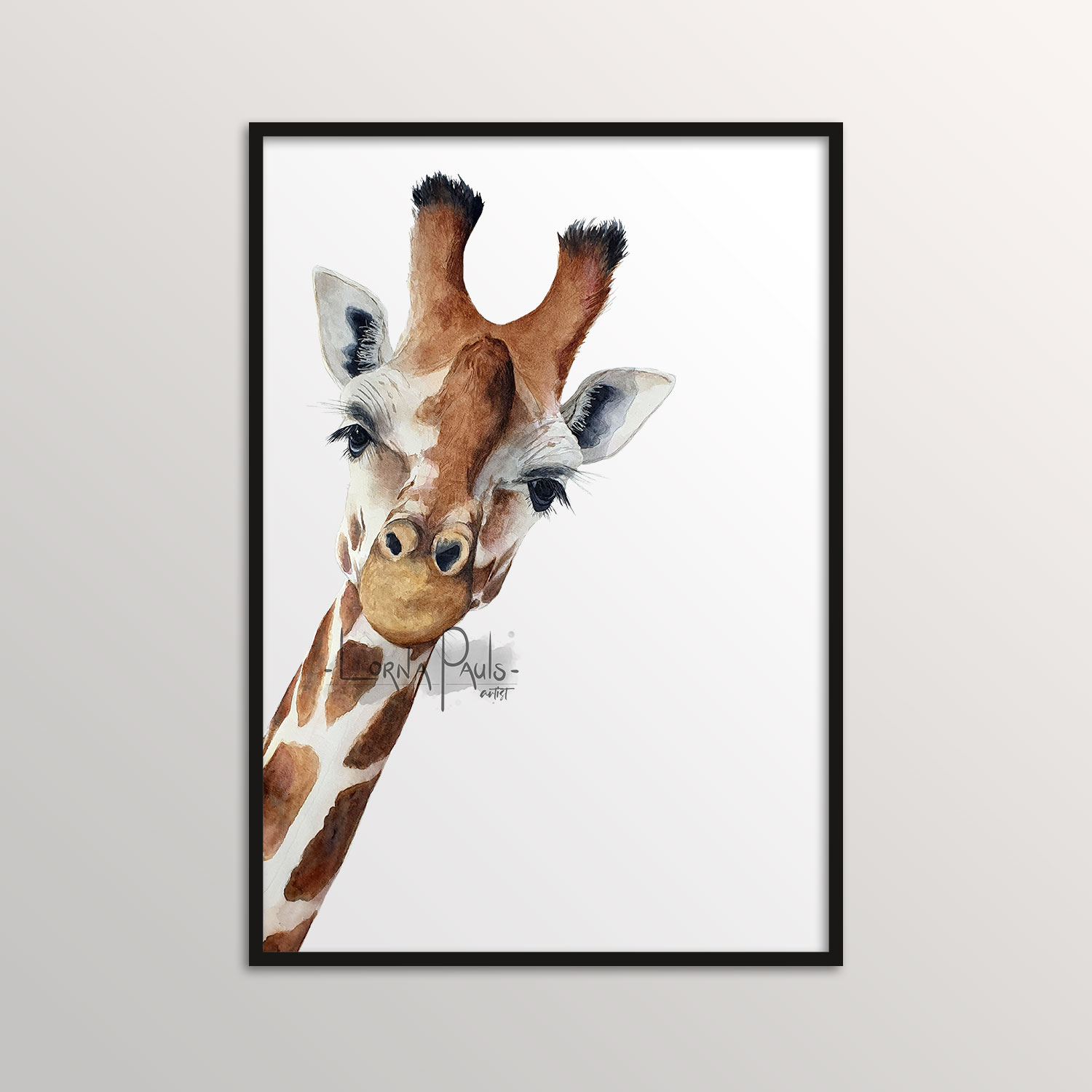 A playful watercolor of a giraffe peeking in to say hello, showing off its long lashes and elegant neck. I love the rich browns of its coat and the black tufts on its ossicones, which add to its charm and character.